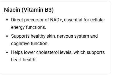 Often considered the gold standard NAD+ precursor, NR is a form of vitamin B3 that efficiently converts to NAD+ in your cells. It’s been extensively studied and shown to effectively boost its levels.